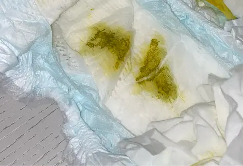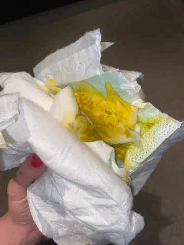 Ze doet wel maar 1x per 24u een goede volle pamper ontlasting. De andere pampers zijn gewoon plas met een streepje stoelgang van een scheetje en die zijn vaak groen… (zie foto hieronder). De andere volle pampers zijn meestal wel goed van kleur, denk ik (zie foto reacties).