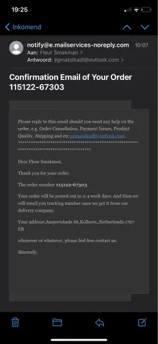 Hi! Heb je ondertussen je bestelling binnengekregen? Ben eigenlijk wel beni ...