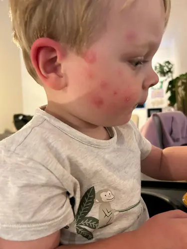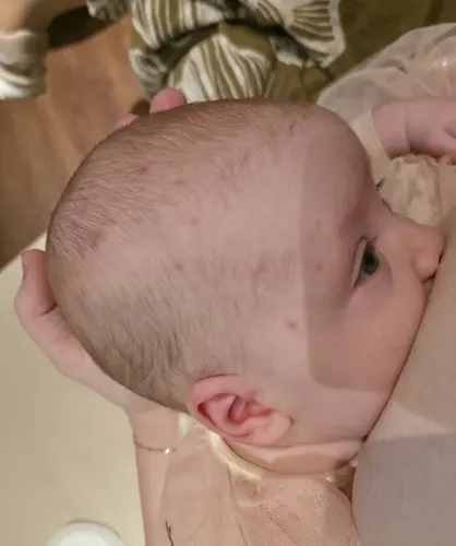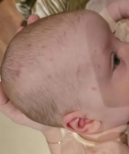 Sinds gisteren heeft mijn dochter (15 wk) opeens allemaal kleine spikkeltjes op haar hoofdje aan de zijkant. Zij heeft hier geen last van voor zover ik kan merken. Ze heeft geen koorts, krabt er niet aan en is er niet onrustig door. Het zijn echt alleen maar spikkeltjes dus geen blaasjes o.i.d. Wel kan je ze voelen als je over haar bolletje aait. Ze zitten echt alleen maar aan 1 zijkant van haar hoofd dus iets als waterpokken lijkt me heel onwaarschijnlijk. Heeft iemand enig idee wat dit zou kunnen zijn?