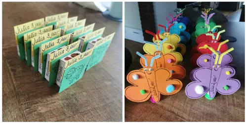 Met de eerste verjaardag hebben we zakjes knijpfruit met een kaartje eraan getrakteerd, met 2 jaar bellenblaas met een vlinder erop geknutseld en met 3 jaar doosjes krentjes met een kaartje erop.