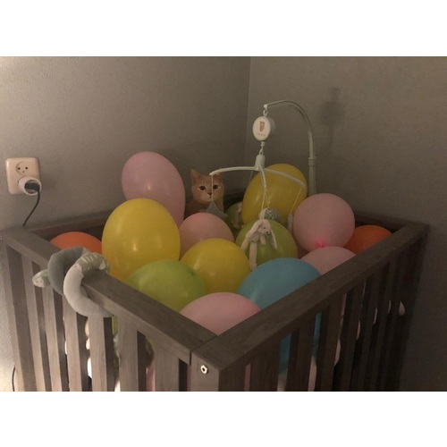 Wij hadden bij ons eerste kindje er voor de bevalling ook ballonnen en aluminiumfolie inliggen, maar dat maakte ze niks uit en 's nachts sliepen ze als nog in de box. Overdag kwamen ze er niet in. Toen de baby er eenmaal in lag moesten ze er helemaal niets meer van weten haha. Ze kwamen niet meer in de buurt van de box. Alleen s avonds legde ik er voor de zekerheid een kleed in zodat er geen kattenharen op het boxkleed kwamen. De box staat nu nog laag voor ons zoontje en zal straks weer omhoog gaan. Dus we zullen zien of ze er dan weer in gaan, maar mijn ervaring is dat ze niet bij of op de baby gaan liggen.
