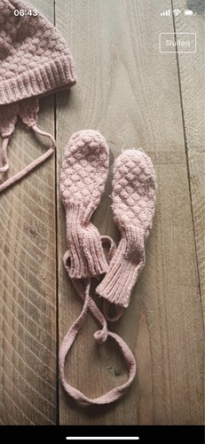Zoon heeft wantjes van de Action (gebreid en met een touwtje eraan).