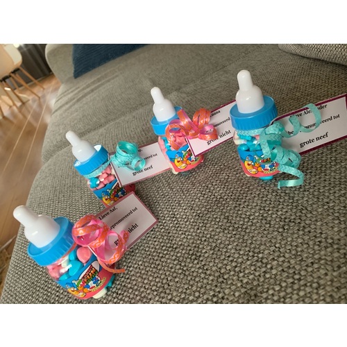 Voor de neefjes en nichtjes hebben we een babyflesje van jamin met snoep en een tekst er op