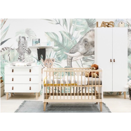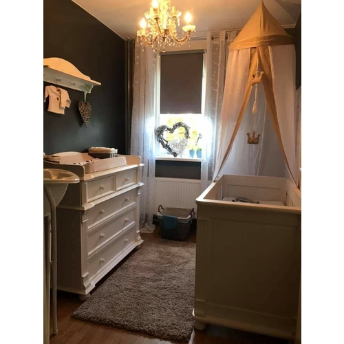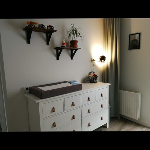 Dit is de babykamer van mijn zoontje van 1 jaar! (Inmiddels is zijn bedje verlaagd, anders klimt hij er zo uit😋) Ik heb al mn babymeubels van de ikea. Misschien een leuke tip: ipv knoppen of beugels kun je ook stukjes leer gebruiken als handvatten, zoals je ziet bij de lades onder het bedje!