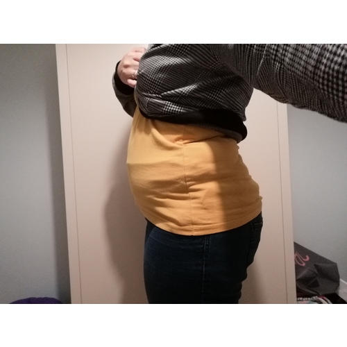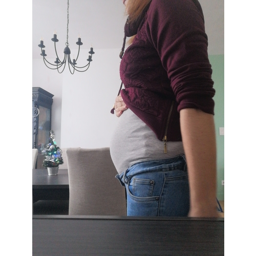 Acht weekjes op deze foto inmiddels 9, ben zelf dus so plat als een plank altijd al geweest; kan ook al 2 weken me normale broeken niet meer verdragen; maar nog net te klein voor de zwangerschapskleding... hier nu dus leggins en pantys met jurkjes hihu