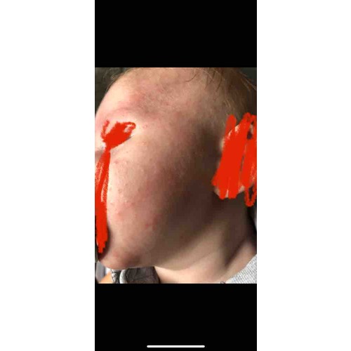 Hier zien jullie hoe het er nu uit ziet. Dit is 1 kant van z’n gezicht. Oogleden en andere kant van gezicht heeft het ook. Z’n kin ook. Ga steeds meer twijfelen of het wel echt acne is en geen allergie of eczeem.