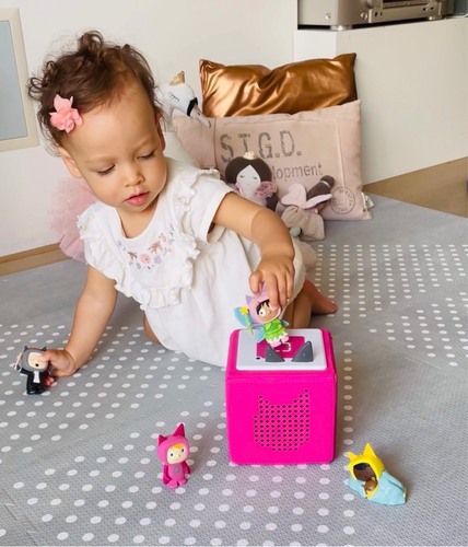 Wij hebben een Toniebox en op elk poppetje hebben we een andere playlist gezet en dan kan ze zelf kiezen wat ze wil horen. Op de dirigent hebben we klassieke muziek voor baby’s van spotify, op het slaap poppetje heb ik zelf wat in gezongen (ik kan niet zingen😂 maar zij vind het leuk😅), op het roze poppetje kinder liedjes om mee te zingen (dat zijn liedjes van vroeger. Geen idee of ze die nu ook nog dingen op school). Maar haar favoriet is nu het fee poppetje. Daar staan liedjes op waar je mee moet doen zoals… zie volgende foto