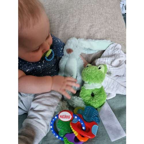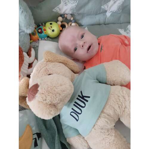 Tijdens het slapen heeft ie nog niet echt een knuffeltje, maar Jokie pakt hij wel altijd met spelen!