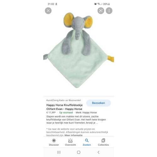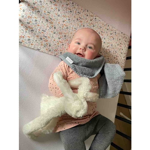 Hier een happy horse konijn-knuffeldoekje 😀 Vind het alleen wat lastig om haar ermee te laten slapen... Zodra ze 'm vastheeft lijkt ze er een soort van ruzie mee te krijgen en eet ze 'm half op.... 🙈 Pas als we 'm weghalen, speentje geven en toedekken gaat ze rustig slapen. Terwijl ik nu wel begin te zien dat ze er af en toe geborgenheid uit haalt. Dus waar doen we dan goed aan....