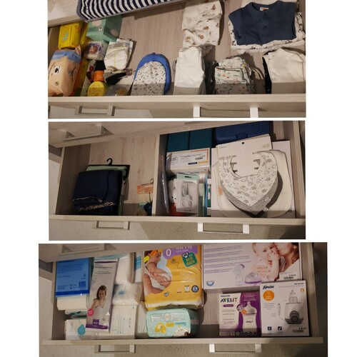 Ik had in de lades (3 naast elkaar )zowieso de rompers, sokken , hydrofiele doeken , en luiers met doekjes doos.