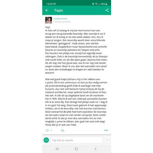 Ik kreeg een koortslip op de dag van de geboorte van onze dochter echt ZOO balen. De eerste dagen in het ziekenhuis met de fles altijd een mondkapje gedragen en afgeplakt. Super goed me handen gewassen en iedere x met alcohol. En ze heeft het gelukkig niet gekregen.