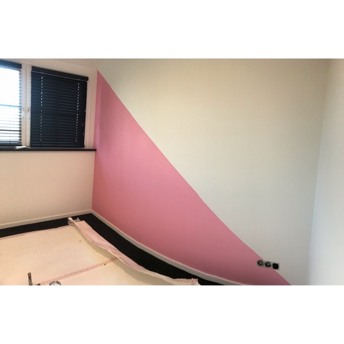 Plak eerst de tape op je muur. Als je structuur hebt, probeer de tape er echt een beetje in te duwen. Daarna verf je er in de oorspronkelijke kleur overheen. Zorg dat de verf de kiertjes dicht maakt. Mag dus best een dikke laag zijn. Dat laat je dan goed drogen.