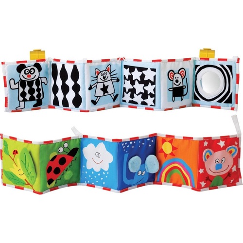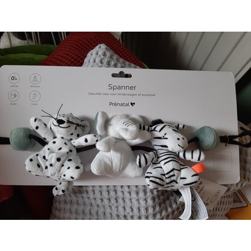Ik kan jullie iets aanraden met veel contrast, zwart/wit stippen of strepen. Een spiegeltje en een rammeltje doet het ook altijd goed. Ik had een hele mooie gebreide met leuke neutrale kleurtjes, heeft hij niet naar gekeken. Die met een zwart gestreept diertje vond hij leuk.