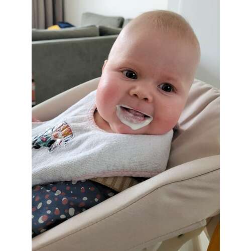 Ja hier ook al mee begonnen. Mijn dochtertje is bijna 8 maanden. Ze vindt het heerlijk! Griekse yoghurt met vers fruit en/ of muesli is hier een succes!