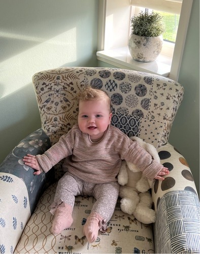 4,5 kilo bij geboorte dus 9 kilo zou idd ‘mogen’, 11 kilo niet. Als je haar ziet denk je overigens niet wowwwww wat een vetzak (zie foto, gisteren gemaakt) maar er is gewoon weinig ‘baby’ meer aan, ook qua motoriek en uitstraling. Als ik online kleertjes koop moet ik vaak bij de peuters kijken ipv baby’s (ze heeft al maat 80/86, mede door haar forse benen), stiekem vind ik dat wel jammer soms. Ze is eigenlijk nooit ‘schattig klein’ geweest, al is ze voor ons natuurlijk de schattigste en liefste en leukste, hihihi. Ze is gezond en happy, dat telt! Dus hoewel we de begeleiding van het CB aanvaarden en er positief mee omgaan, relativeren er het ook wel echt. 😅