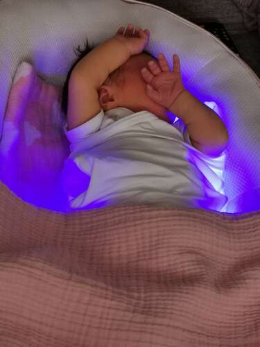 Ze hebben tegenwoordig ook een dekentjes/matrasjes met het blauwe licht. Dan ligt ze niet onder de lamp maar wordt ze erin gebakerd. Dat is bij ons kindje gebeurd toen hij een paar dagen oud was. Hij kreeg ook een beschermend brilletje op.