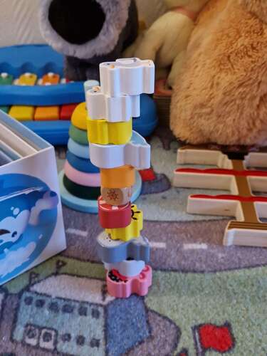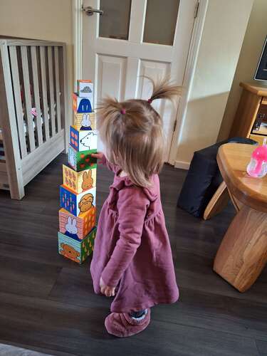 Wat knap!! Hier kan ze ook goed stapelen, maar ze is nog steeds een grote voorstander van het zo snel en zo hard mogelijk om gooien. Dus heb niet goed inzichtelijk hoe hoog ze kan stapelen haha. Maar zeker niet zo hoog als jouw zoon.