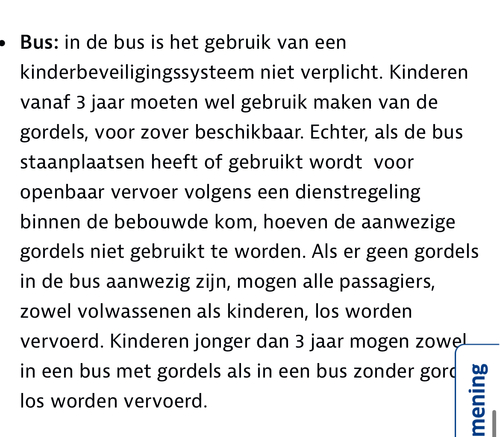 Ik zou het zelf eng vinden en niet doen (dan idd liever vastgesnoerd in de wagen die dan op de rem staat) maar hierbij de geldende regels hierover. Komt van website ANWB. Als je het goed voorbereidt/inleidt, zo van “Ohhhw we gaan met de bus! *Naam* moet dan wel in de buggy, anders kan het niet, ga je mee met mama?!” Met een big smile. Ik merk dat dat bij onze dochter wel helpt, dat je het vooraf goed uitlegt en ook zegt: en daarna mag je weer lekker los lopen. Veel plezier!