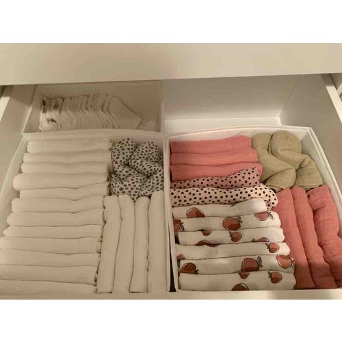 Wij hebben ook alleen de maat die ze past in de commode liggen, te grote en te kleine kleren hebben we in doorzichtige opbergbakken op zolder (per maat opgeruimd)