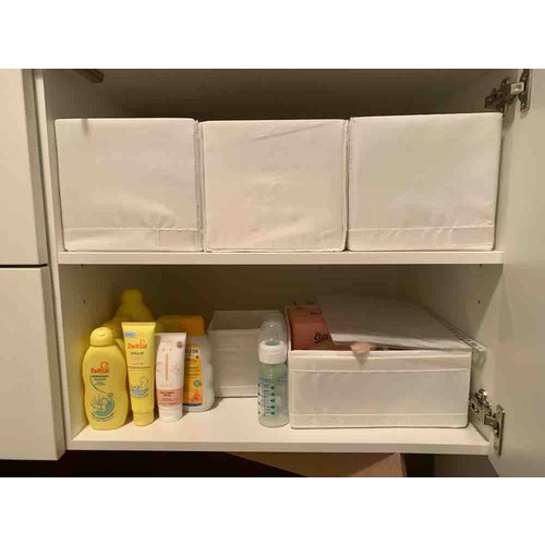 Ik zou de dingen die je vaak grijpt (en bijv bij het verschonen nodig hebt) in mandjes boven op de commode zetten (of evt op plankje er boven) en dan reserve in de bovenste laden, zoals drogisterij dingetjes, spuugdoekjes etc.