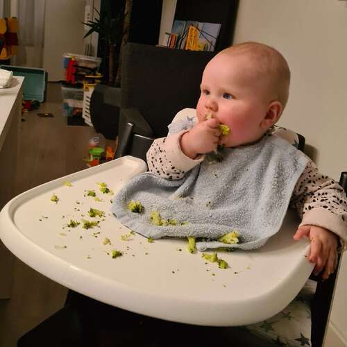 Hier zit ze ook heerlijk aan de broccoli in de trip trap, tafelblad van haar is gelijk aan de onze 😊