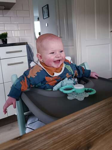 Wij hebben een Ikea kinderstoel en zo’n houten stoel wat op de triptrap lijkt. De houten hebben we nu opgeborgen staan, omdat hij zo groot is en Rick er nog veelste klein voor is. In de plastic Ikea stoel, kan hij al wel best goed zitten. Ook deze is toch nog vrij laag