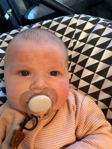 In het begin waren het alleen wat vlekken, die kwamen en gingen weer, daarna werden het bultjes, wat leek op babyacne, uiteindelijk werd het zo erg dat haar hele gezicht kapot ging van het eczeem! Op de foto was het hele begin, hier viel het nog reuze mee!