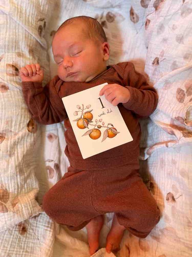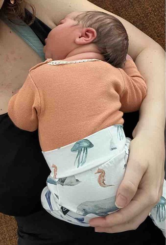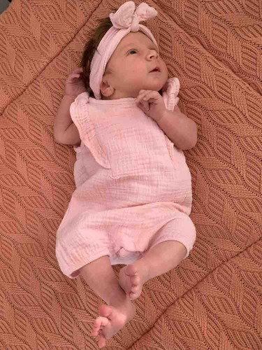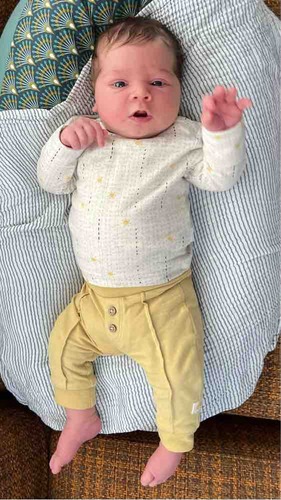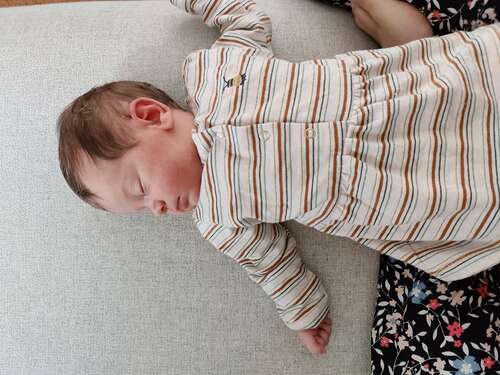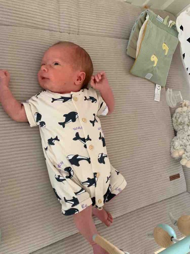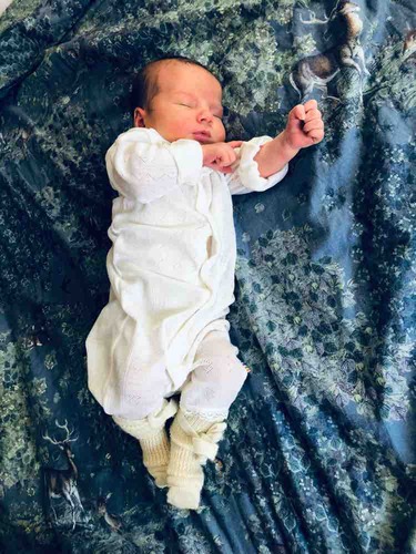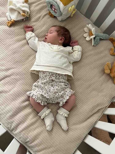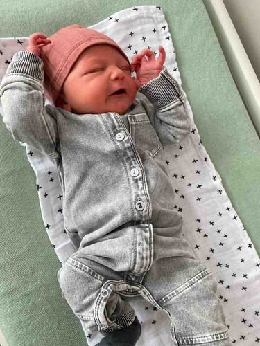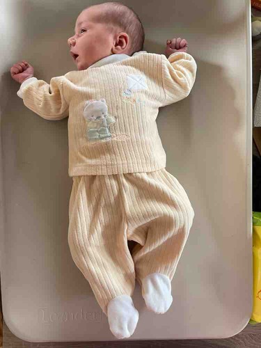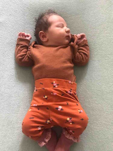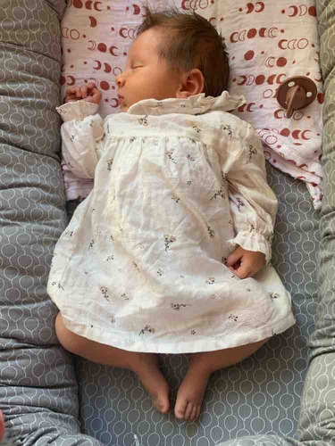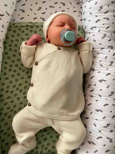Hier is onze kleine Apolline 3 dagen oud, met een wolzijden pointelle pakje van Joha en wollen sokjes.