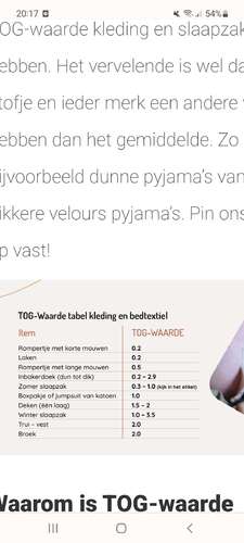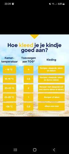 Ik vraag me dit ook af. Ik heb een nieuwe slaapzak van Jollein voor de winter, met mouwen tog 3 en zonder mouwen tog 2. Als mijn dochter een lange mouwen romper draagt en de slaapzak zonder mouwen, hoeveel graden moet de kamertemperatuur dan bijvoorbeeld zijn? Gedoe allemaal 😅 ik probeer ook vooral goed te kijken naar mijn eigen dochter maar ik vraag het me toch af