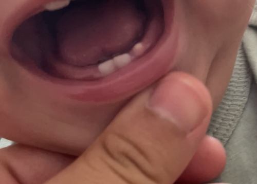 Is het niet gewoon een tand die daar rondhangt tot hij doorkomt? Gaan jullie al naar de tandarts? Ik dacht dat dat pas later hoefde.
