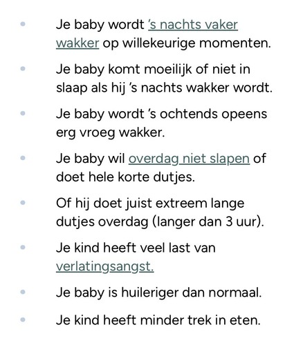Volgens mij is het hier ook begonnen! Sowieso sprong 6 volgens de app maar denk nu ook de slaapregressie. Weigert het laatste dutje van de dag waardoor die kei moe is . Vervolgens ‘s nachts elke 2 uur kort huiltje, lijkt gewoon te slapen dan maar mama wordt er steeds wakker van😅
