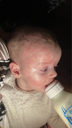 Tijdens de fles word de uitslag roder. Wel is de uitslag constant aanwezig, voelt wat dikkig en ruw/schraal aan. We zijn ook even gestopt met de groenten omdat ik geen idee heb waar het zo ineens weg komt.