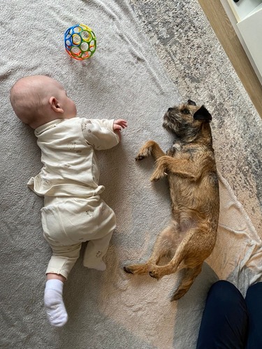 Mn border terriër is ook zooooooo zachtjes zo lief en zo voorzichtig. Ik probeer het ook te voorkomen en zeg NEE als ik zie dat hij liefkozend kusjes wilt geven. Maar heel eerlijk als hij straks gaat kruipen zal ik niet alles tegen kunnnen houden denk ik. M’n hond speelt ook met het baby speelgoed die snapt het verschil natuurlijk niet 😅. DUs ik volg even!