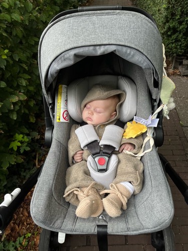 Hij wilde sowieso niet in de reiswieg, een groot drama, dus zette ik altijd de maxicosi op het frame vd kinderwagen. In de maxicosi ligt hij natuurlijk meer ‘vast’ ipv in de grote reiswieg. En hij kan veel meer zien vanuit de maxicosi. Ik heb er nooit een probleem in gezien of van gemaakt.