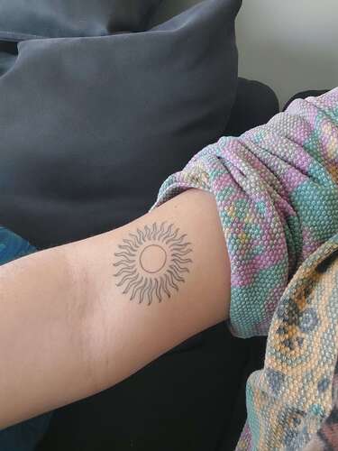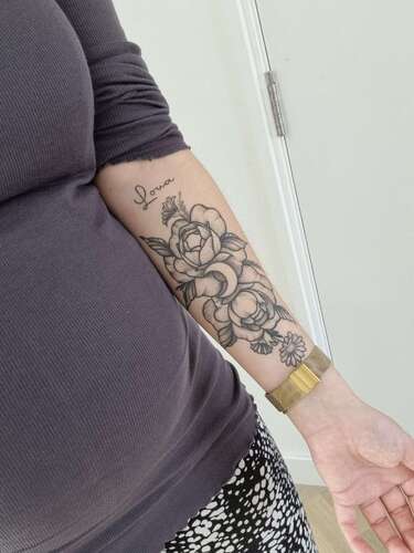 Rond om de tattoo zitten bloemen, maar ook bloemen die mn ouders en zusje hebben getekend. Als de kleine ook zover is om een bloemmetje te tekenen, tattooeer ik die van hem erbij