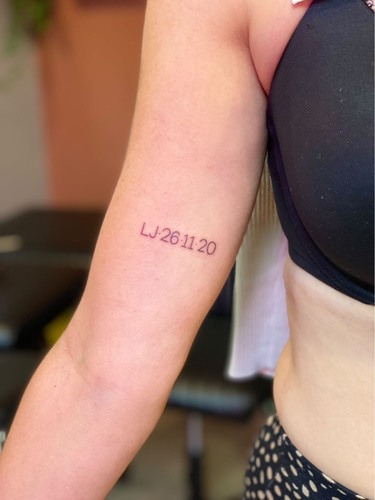 Voor mijn zoon heb ik op mijn boven arm binnenkant zijn initialen en geboortedatum in blokletters en fineline.
