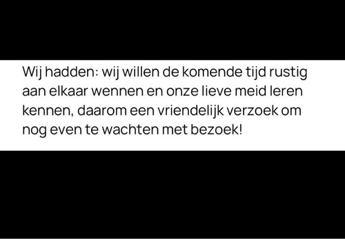 Dan kunnen we zelf aangeven wanneer we een geschikt moment vinden. Zo hebben mijn partner en ik voor nu afgesproken dat we de eerste twee weken alleen onze ouders/broers/zussen/oma's ontvangen. En pas daarna vrienden, verdere familie, collega's enzo.