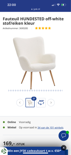 Deze hebben wij (incl bijbehorende hocker). Ik zie dat hij nu goed is afgeprijsd https://jysk.nl/woonkamer/fauteuils/fauteuil-vildsund-white-stof