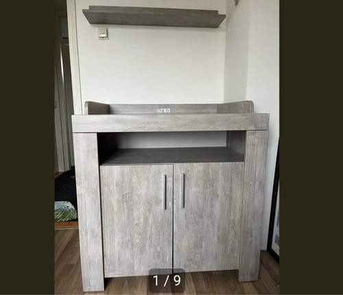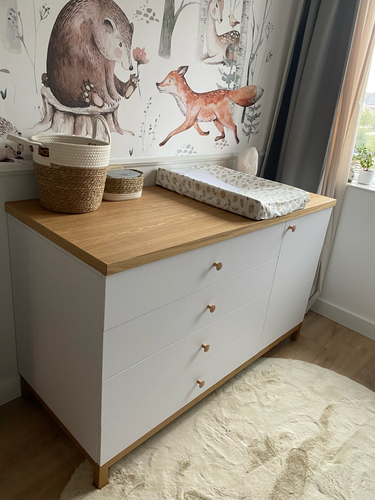 Wij hebben aan de kant van de commode de onderste helft lichtgrijs geverfd, net als de rest van de kamer en daarboven bosdieren behang aangebracht. Dit hadden we al gedaan bij onze dochter en de kamer blijft nu hetzelfde. 😊