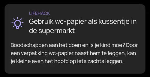 Kind zit in karretje, is moe en dus pak je uit de winkel een verpakking wc papier.