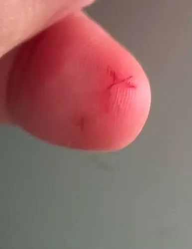 Ja heb het droog gemaakt, en nog met natte hydrofiele doekje schoongemaakt. Bloedt niet meer, is wel een goeie sneetje… zo stom…. Blijkbaar had hij ook een andere die al opgedroogd is (donker)… voel me zo stom..