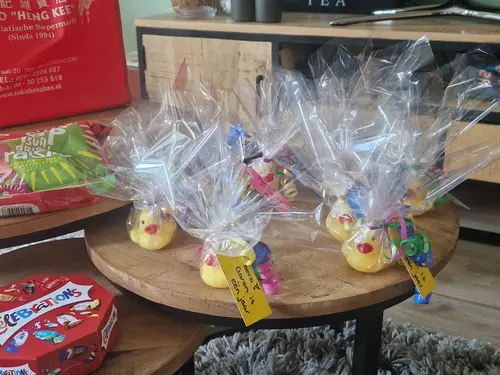Ik doe denk ik of bellenblaas met een gepersonaliseerde sticker of uitdeelboekjes. Voor leidsters dan chocolade van chocolatier.