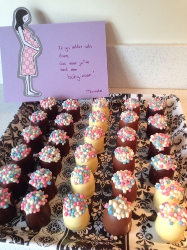 Ik heb een appeltaart gebakken en neergezet en van de directie uit werden er lekkere broodjes bezorgd bij de lunch. Als ik bevallen ben heb ik voor de kinderen(werk op kdv) een zakje met een krijtje in vorm van een ijsje, doosje rozijntjes en een mini bellenblaas met de namen erop (heb zelf een apparaat om die stickers te maken) en voor de collega’s soesjes met chocolade en blauw/witte muisjes erop.