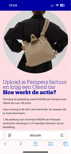 Hii! Ik had zelf al maanden mijn oog op deze tas als luiertas maar vond hem toch wel aan de dure kant. Nu heeft bol.com een actie dat je hem gratis krijgt besteding van 50 euro aan pamper producten! Dacht misschien hebben meer mama’s hier iets aan