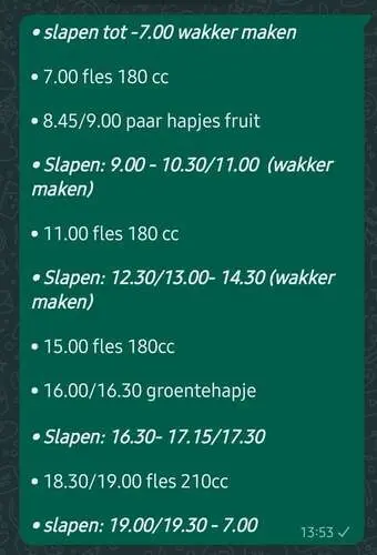 Wij laten haar dan een dutje van een half uur doen of anders door laten slapen tot 22:30 en dan een nachtflesje.
