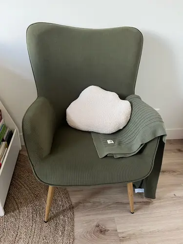 Ik vind de schommelstoel van de jysk echt heel mooi en zit heerlijk. Ik baal er alleen van dat ie enkel in een lichte blauwe kleur komt (wat vloekt in onze groene kamer 😂) 🥲