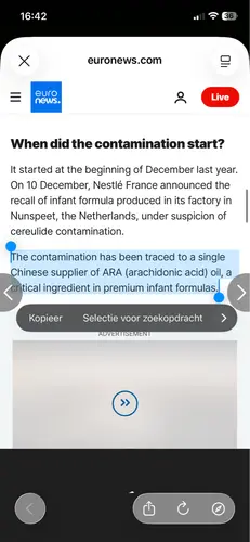 Ze vertelde mij dat in NAN 2 opti pro het arachidonzuur deze niet aanwezig is dus deze kan nooit gecontamineerd zijn met dit virus. Dus als je een ander kunstvoeding merk wil geven en toch twijfelt dan zou ik kijken naar de ingredi毛nten en zien dat er geen arachidonzuur in zit.