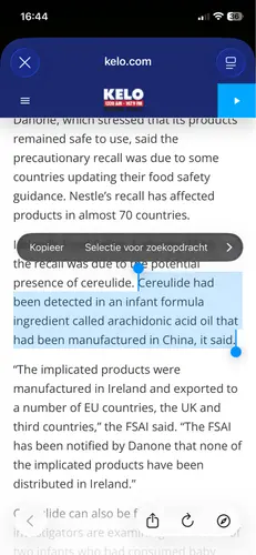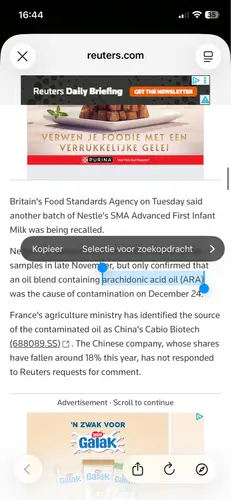 Mijn apotheek vertelde me dat de grondstof die besmet is met het virus arachidonzuur is. Danone (nutrilon) en Nestl茅 (NAN) hebben bij dezelfde leverancier deze grondstof gekocht.