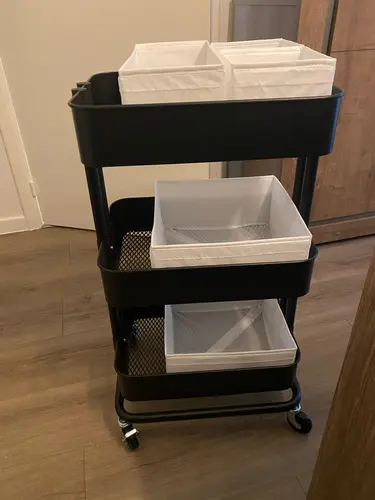 Dit heb ik voor de slaapkamer en living. Is een mobiele luierkar noem ik het haha en daar ga ik luiers, natte doekjes, hydrofiele doeken,… insteken en kan ik overal mee naartoe rijden met dan een verschoningsmatje bij. Als mijn vriend wakker wordt in de nacht tijdens het verschonen so be it