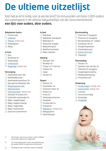 Verschilt echt per persoon en per baby. Waar ik spijt van heb, is dat ik een complete babykamer heb gekocht. Een los ledikant, hoge ladekast (bijvoorbeeld ikea) en een gewone kledingkast waren veel beter geweest omdat die tot volwassen leeftijd gewoon goed blijven. Commode gebruik je niet meer en babykast is onhandig. Verder deden wij pas traphekjes toen ze rond de 8 maanden was en al dat kleine spul kan je altijd bijkopen. Autostoel en kinderwagen zou ik echt voor naar een grote zaak die alles heeft staan zodat je het kan uitproberen en aanvoelen